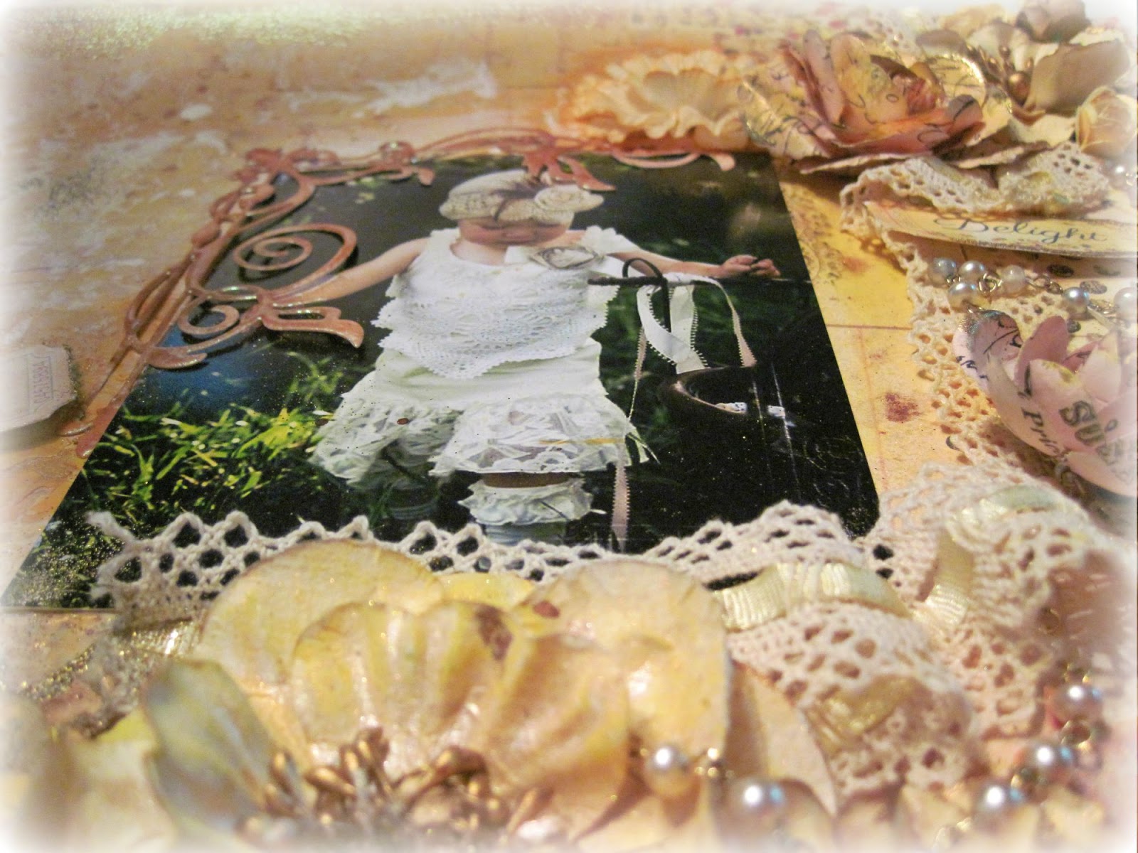 I added the beautiful lace trim (available in the kit) and "Prima" flowers (add on with the kit).